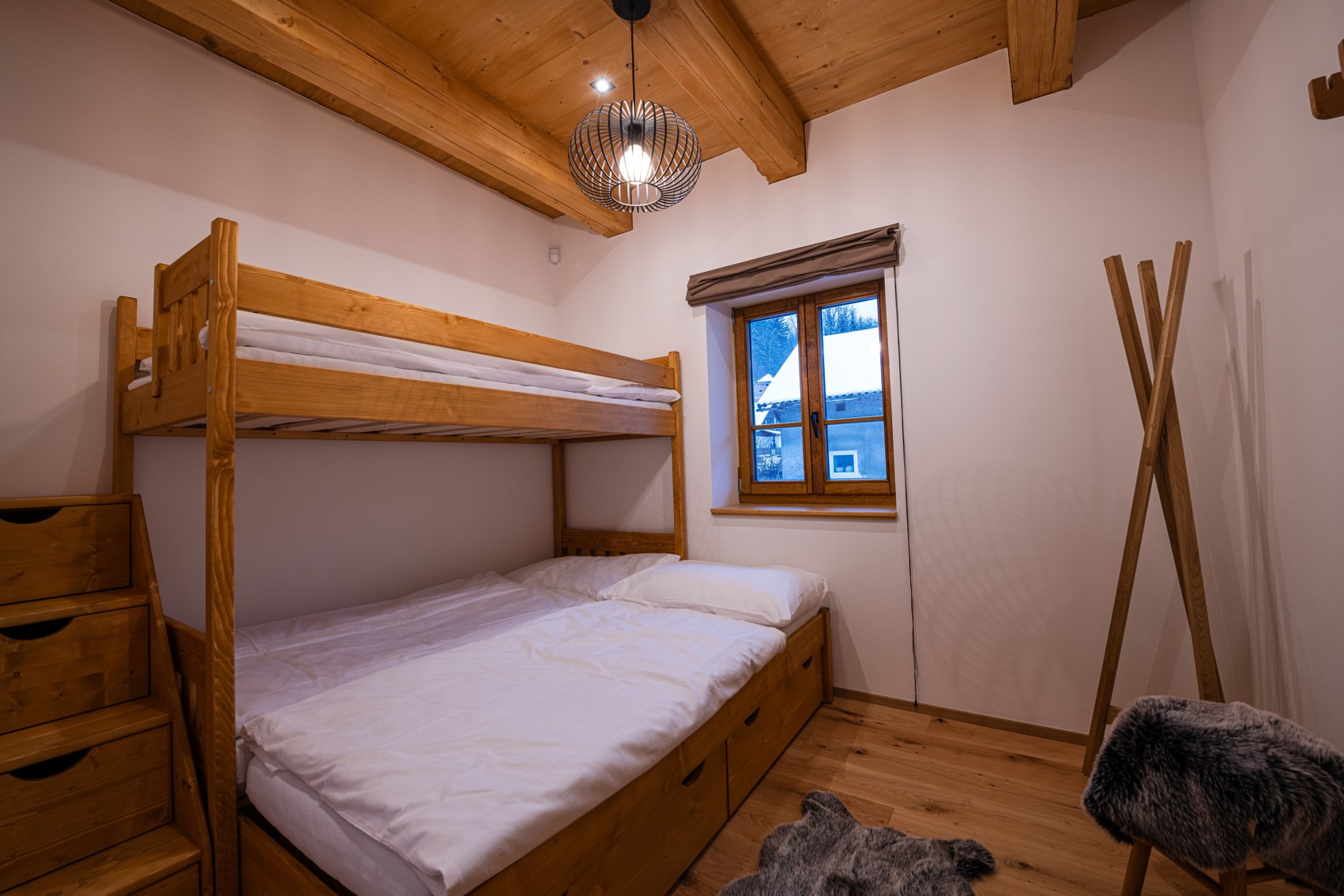 The apartment offers two separate bedrooms that are designed with your maximum comfort in mind. The master bedroom welcomes you with a solid oak double bed with high-quality mattresses, where you can adjust the firmness of the mattress to your preference. The second separate bedroom has a solid wood double bed, bunk beds and generous storage space – the perfect choice for families or larger groups.