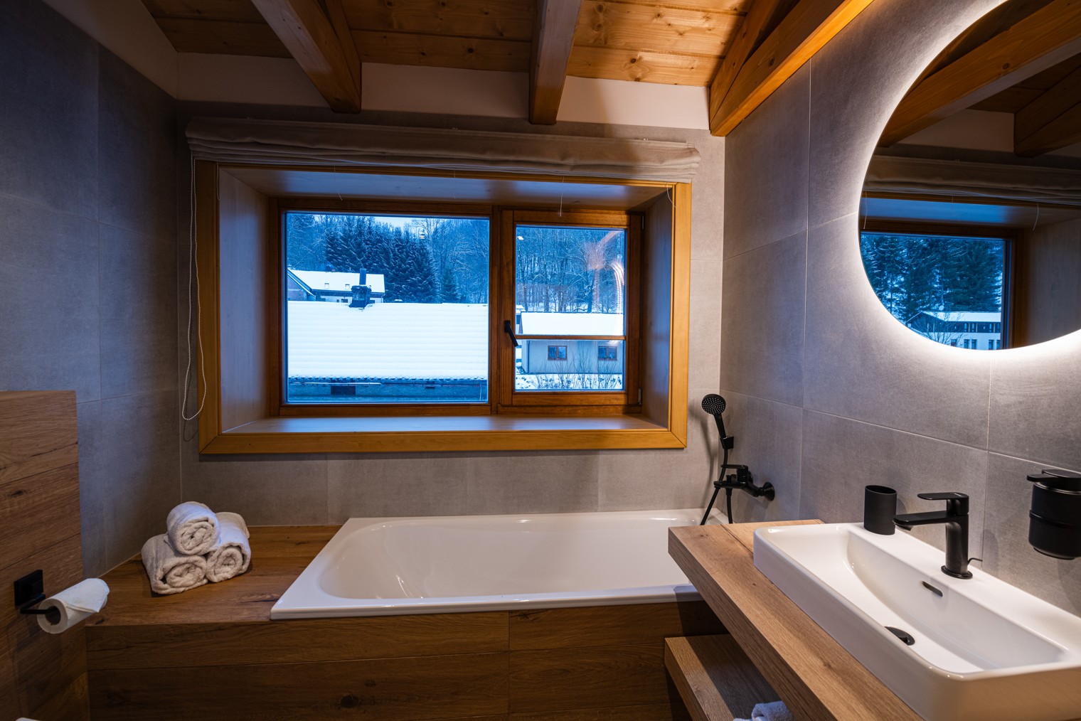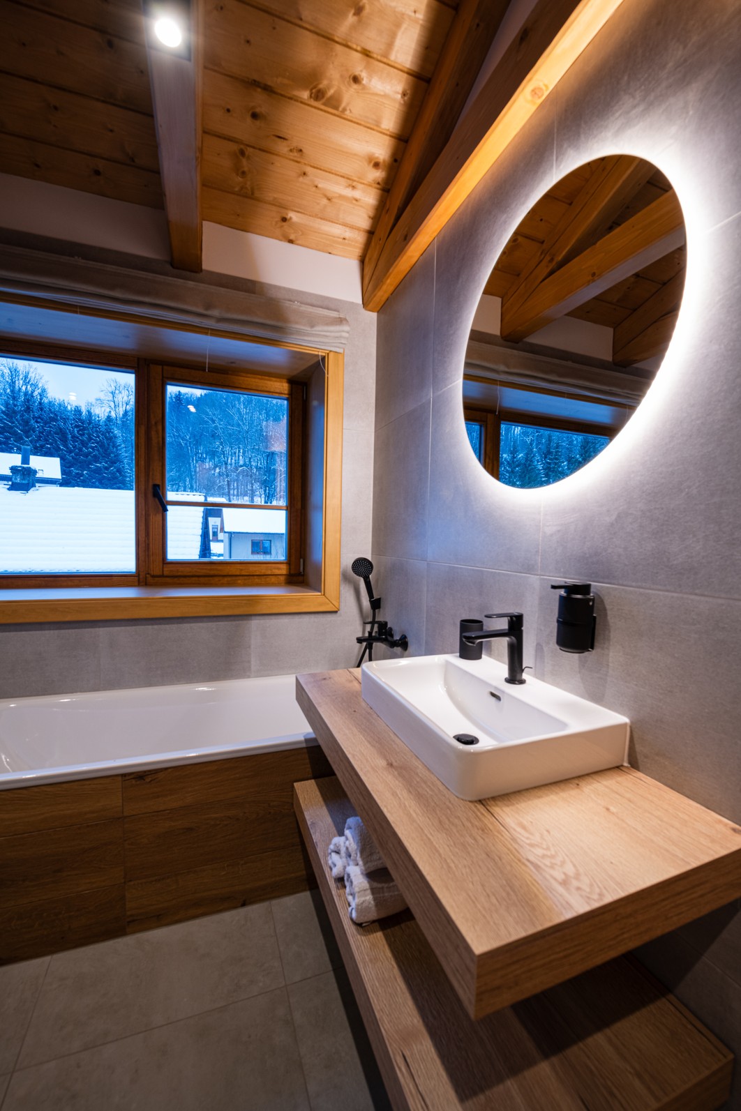 Relax in the spacious bathroom with a separate shower and large bathtub, from which you can watch the starry night sky through the large window.