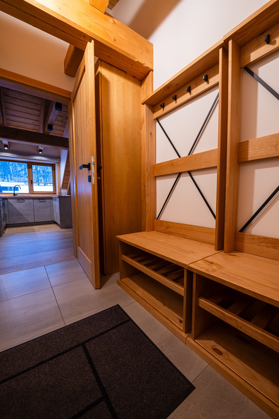 The spacious vestibule offers plenty of room for storing shoes and coats.